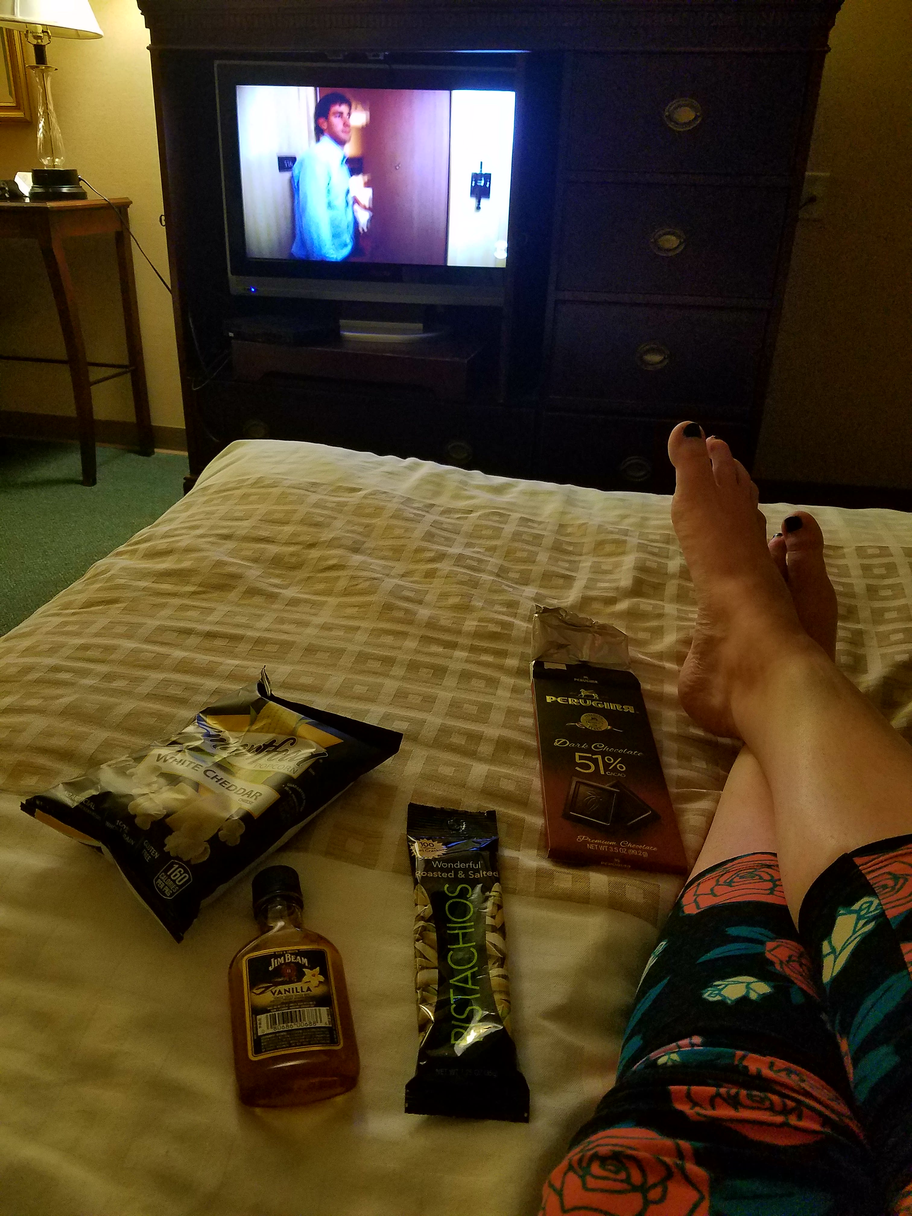 I slid into a spot, grabbed my bag, and hiked my way to the front door. Once I was checked in I was so ready to unwind. I walked into the room, took a shower, and sat down to enjoy some of the best TV that 12:00 am has to offer, The Office reruns. I rummaged through my bag and found my stash of goodies. I munched, drank, and simply enjoyed my time alone.