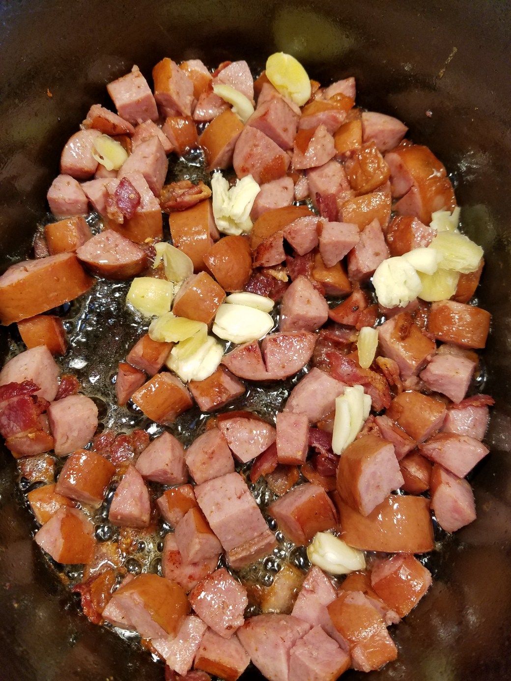 - Now add the sausage and garlic to the bacon and flavor boosting happy juice. You are going to want to brown the sausage to help build flavor.