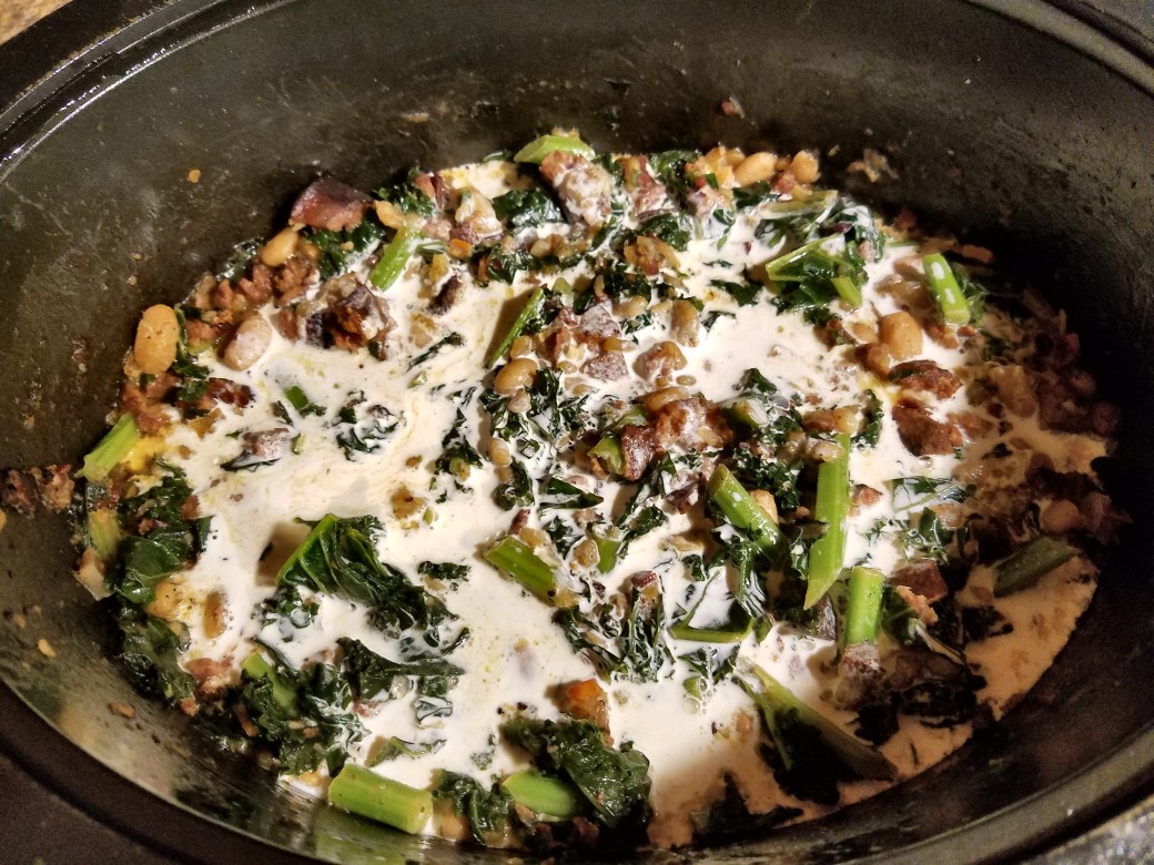 - Now that everything is cooked and your ready for one of the only healthy aspects of the dish. Toss in the kale and cover. Let the kale steam in the crockpot for about 30 minutes.